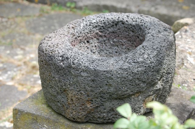 Une mesure médiévale taillée dans une roche volcanique.