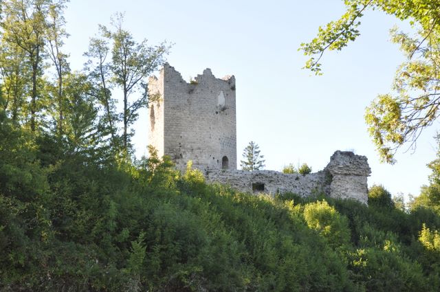 La courtine très ruinée laisse en vue l'entrée de la tour maîtresse.